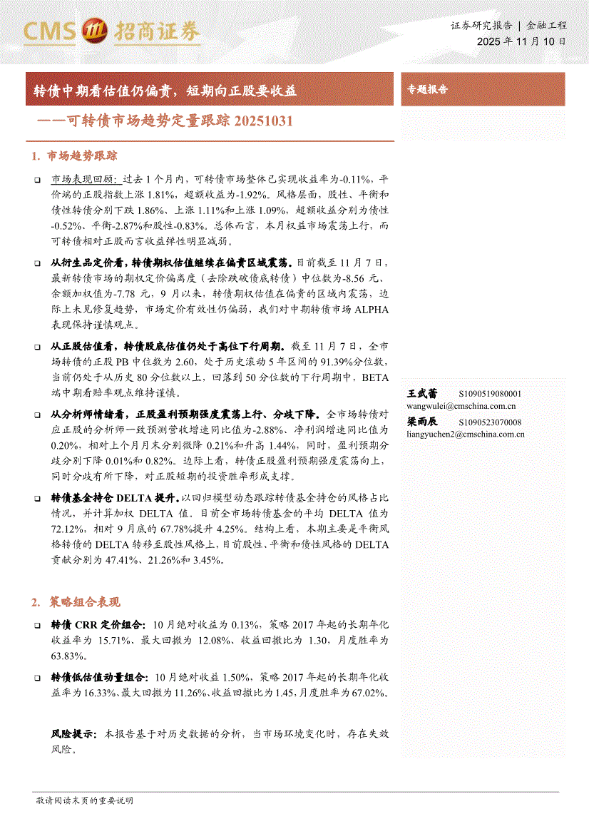 招商证券-可转债市场趋势定量跟踪:转债中期看估值仍偏贵,短期向正股要收益-251110