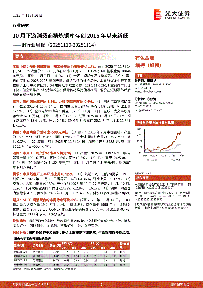 铜行业:光大证券-铜行业周报:10月下游消费商精炼铜库存创2015年以来新低-251116