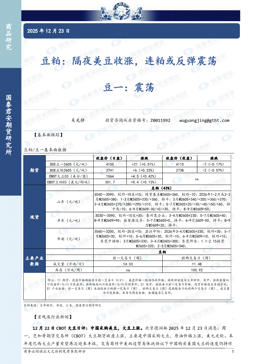 国泰君安期货-豆粕:隔夜美豆收涨,豆粕或反弹震荡,豆一,震荡-251223