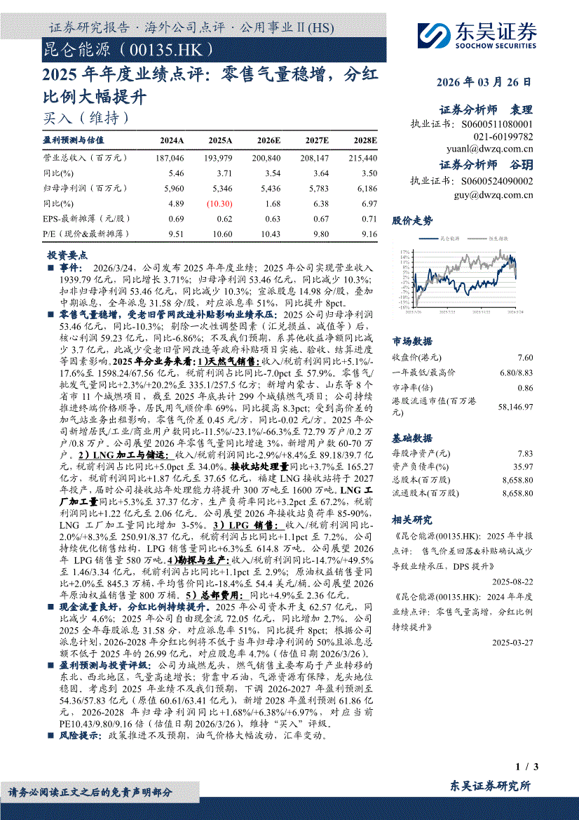 昆仑能源:东吴证券-昆仑能源-0135.HK-2025年年度业绩点评:零售气量稳增,分红比例大幅提升-260326