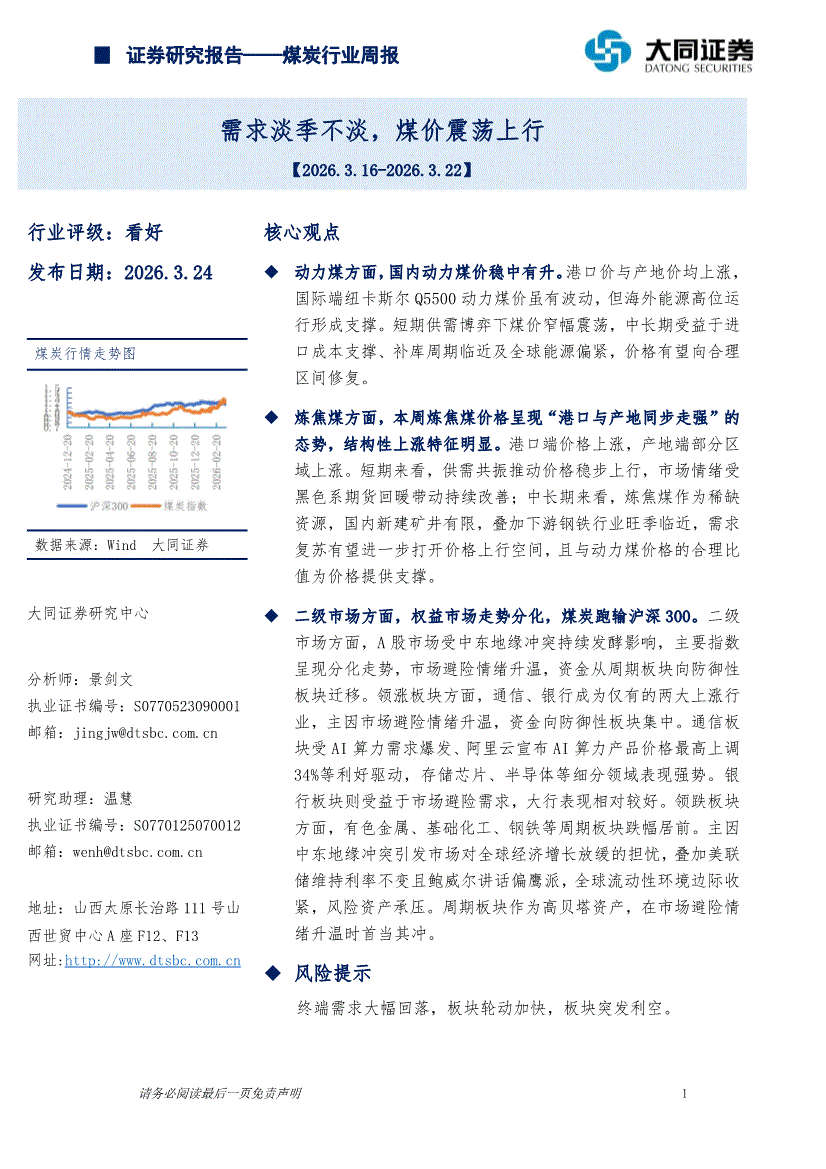 煤炭行业:大同证券-煤炭行业周报:需求淡季不淡,煤价震荡上行-260324