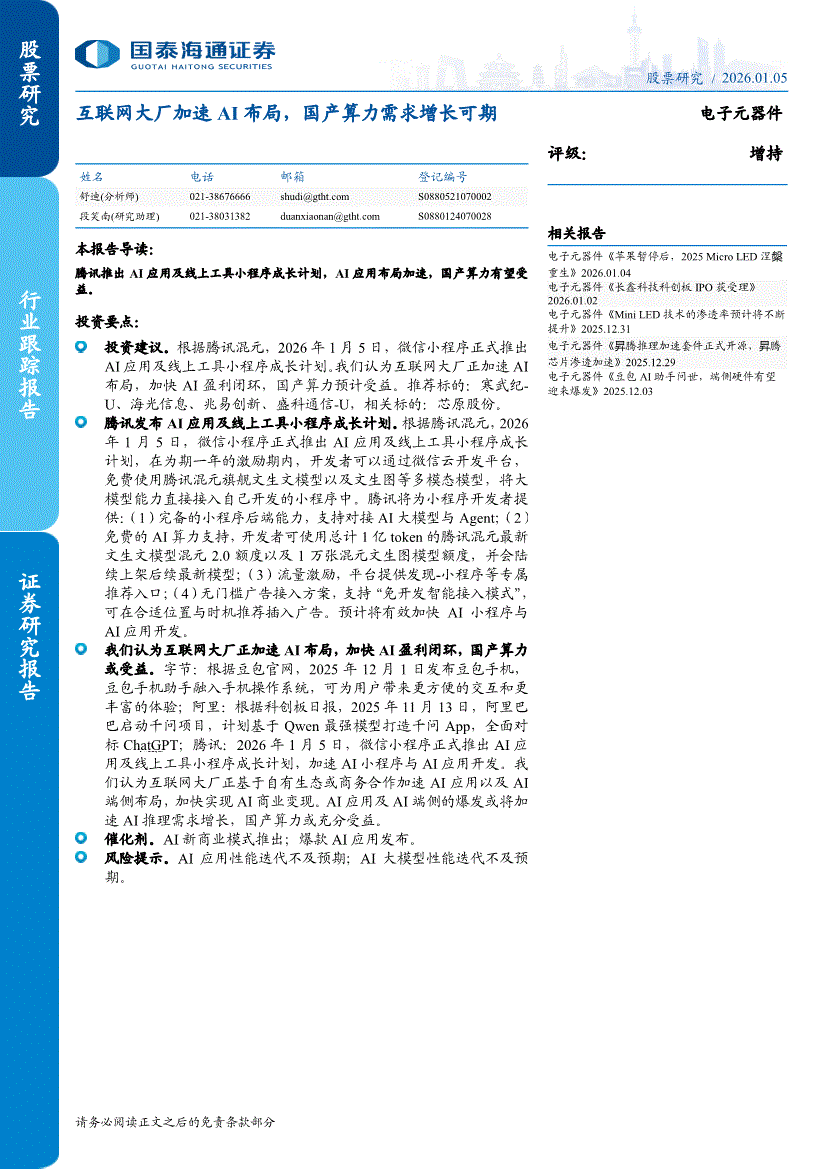 电子元器件行业:国泰海通证券-电子元器件行业:互联网大厂加速AI布局,国产算力需求增长可期-260105
