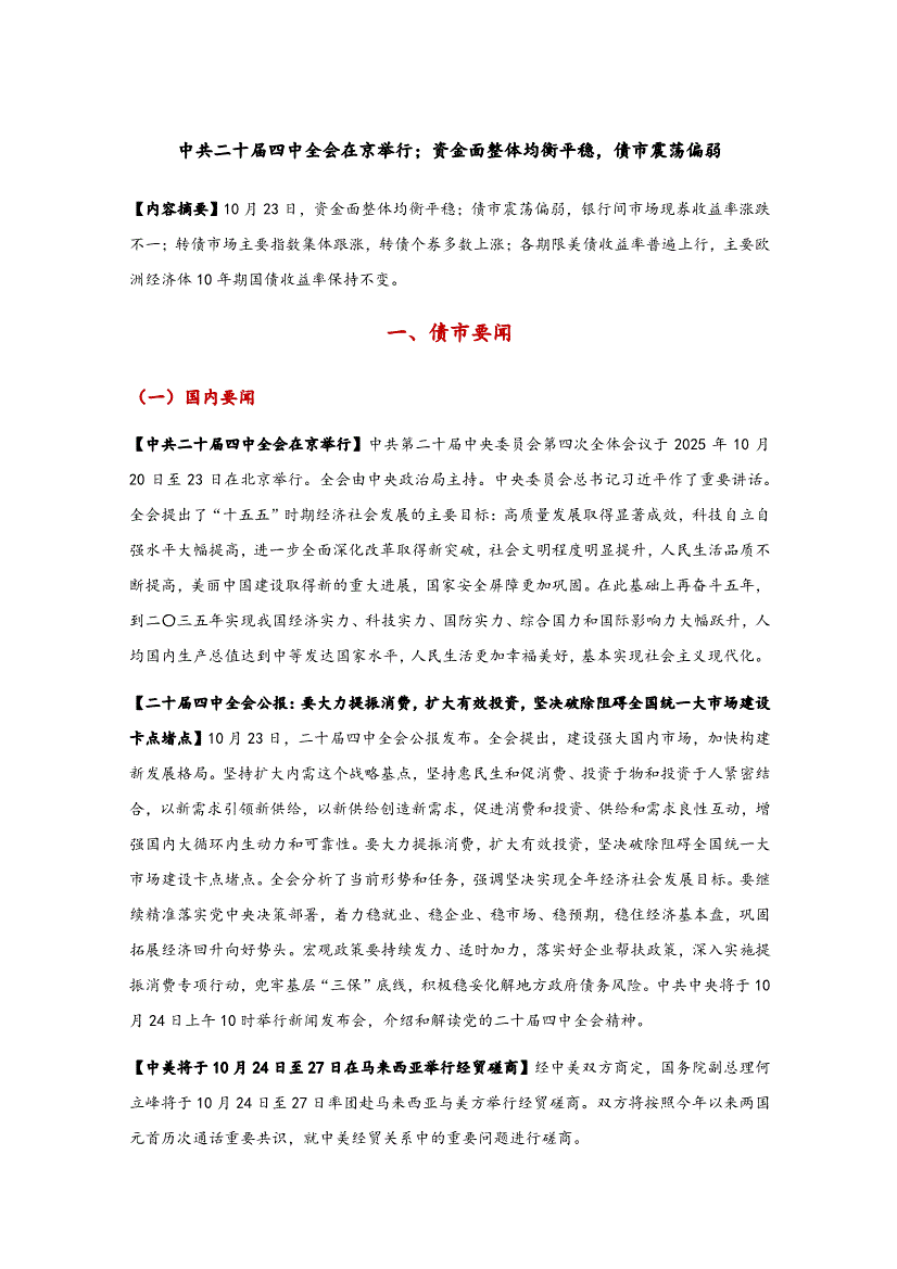 东方金诚-中共二十届四中全会在京举行;资金面整体均衡平稳,债市震荡偏弱-251029