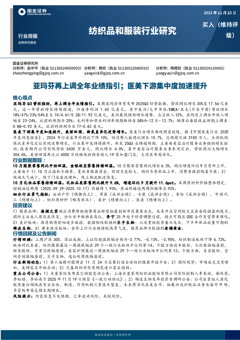 纺织品和服装行业:国金证券-纺织品和服装行业周报:亚玛芬再上调全年业绩指引;医美下游集中度加速提升-251123