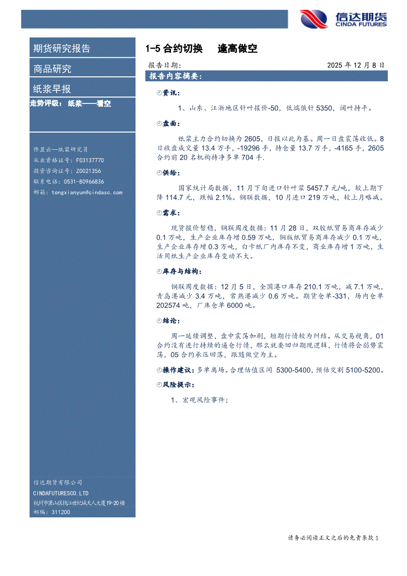 信达期货-纸浆早报:1~5合约切换,逢高做空-251208