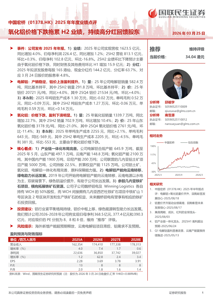 中国宏桥:国联民生证券-中国宏桥-1378.HK-2025年年度业绩点评:氧化铝价格下跌拖累H2业绩,持续高分红回馈股东-260325