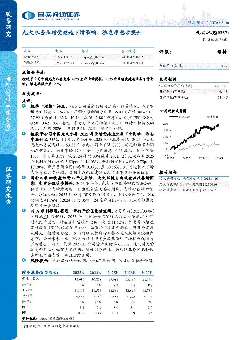 光大环境:国泰海通证券-光大环境-0257.HK-光大水务业绩受建造下滑影响,派息率稳步提升-260306
