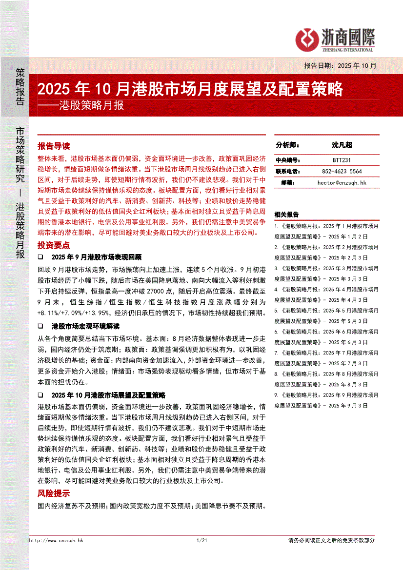 浙商国际-港股策略月报:2025年10月港股市场月度展望及配置策略-251006