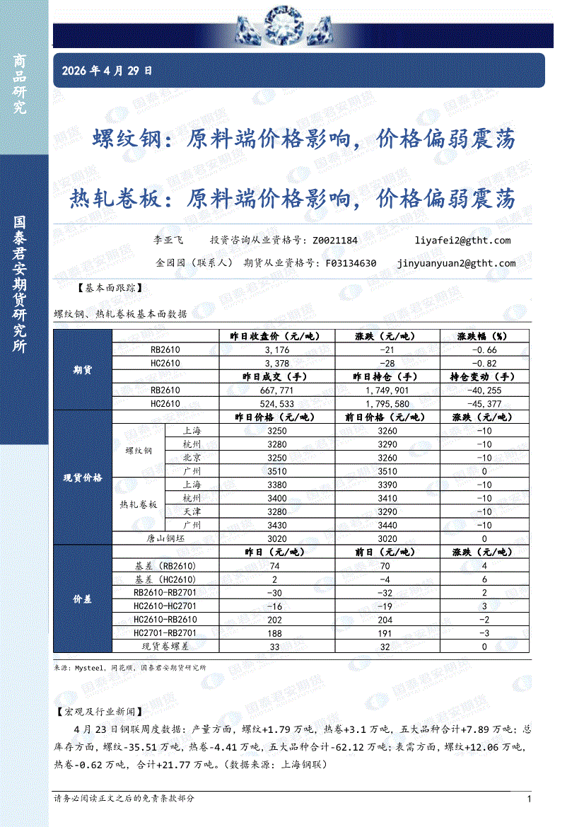国泰君安期货-螺纹钢:原料端价格影响,价格偏弱震荡,热轧卷板,原料端价格影响,价格偏弱震荡-260429