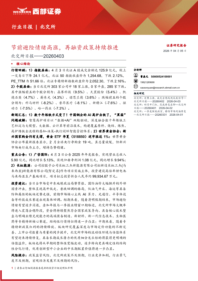 西部证券-北交所日报:节前避险情绪高涨,再融资政策持续推进-260405