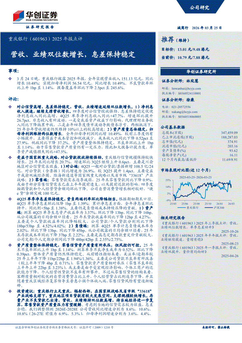 重庆银行:华创证券-重庆银行-601963-2025年报点评:营收、业绩双位数增长,息差保持稳定-260325