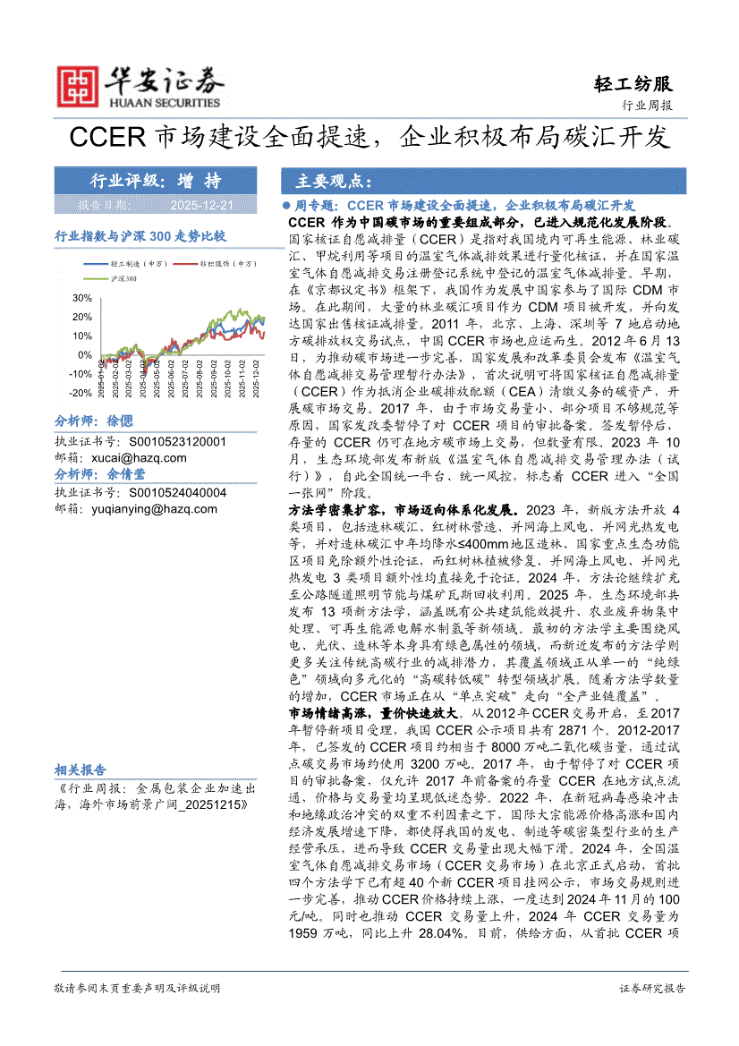 轻工纺服行业:华安证券-轻工纺服行业周报:CCER市场建设全面提速,企业积极布局碳汇开发-251221