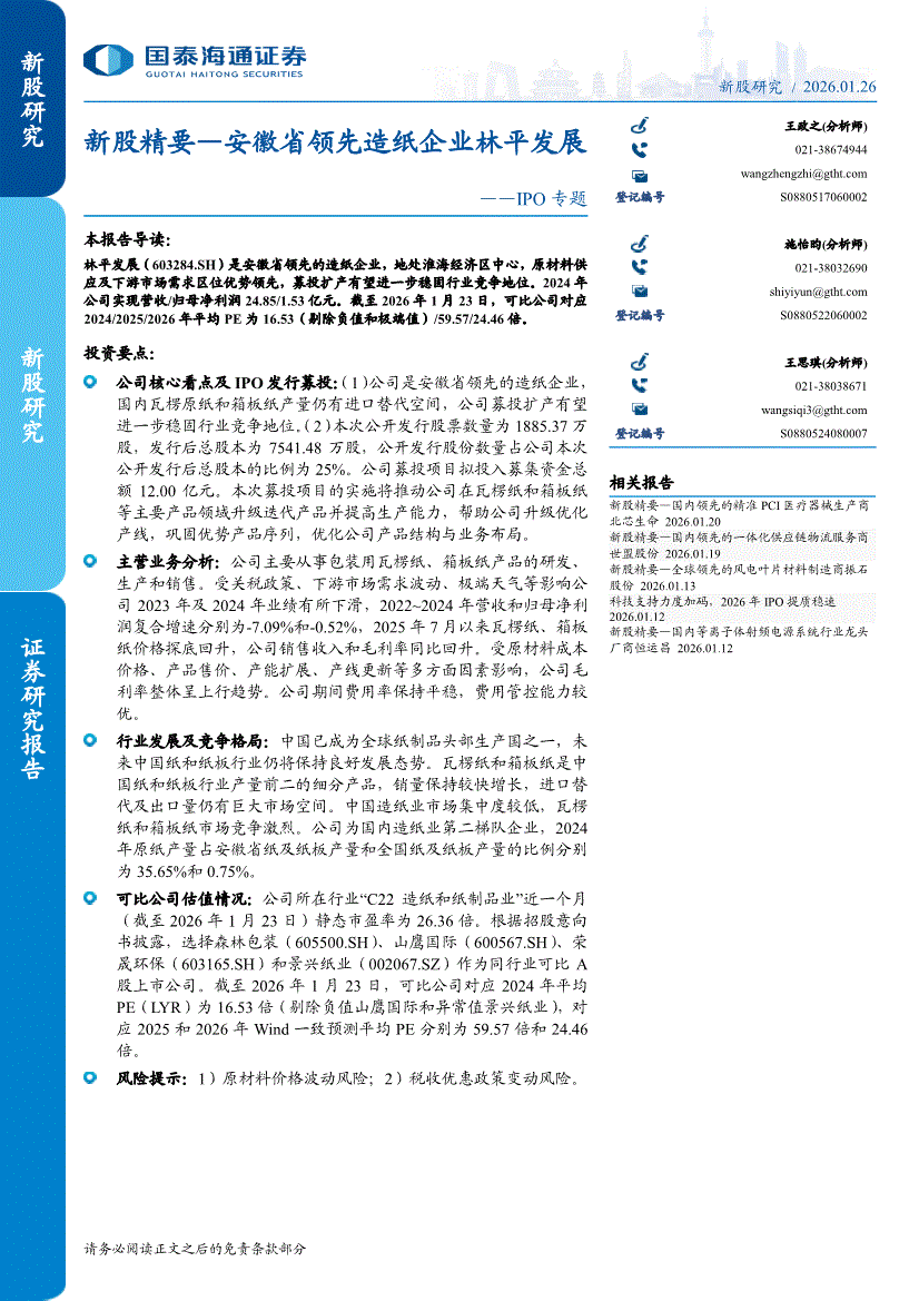 国泰海通证券-IPO专题:新股精要,安徽省领先造纸企业林平发展-260126