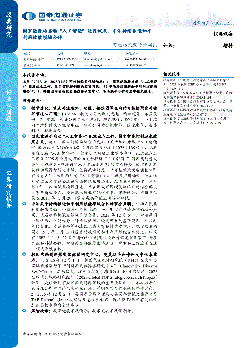 可控核聚变行业:国泰海通证券-可控核聚变行业周报:国家能源局启动“人工智能”能源试点,中法持续推进和平利用核能领域合作-251206