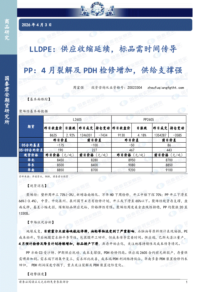 国泰君安期货-LLDPE:供应收缩延续,标品需时间传导,PP,4月裂解及PDH检修增加,供给支撑强-260403