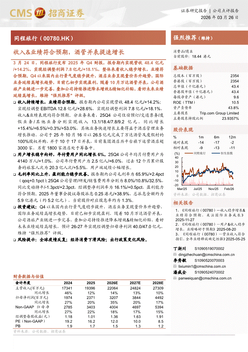 同程旅行:招商证券-同程旅行-0780.HK-收入&业绩符合预期,酒管并表提速增长-260326