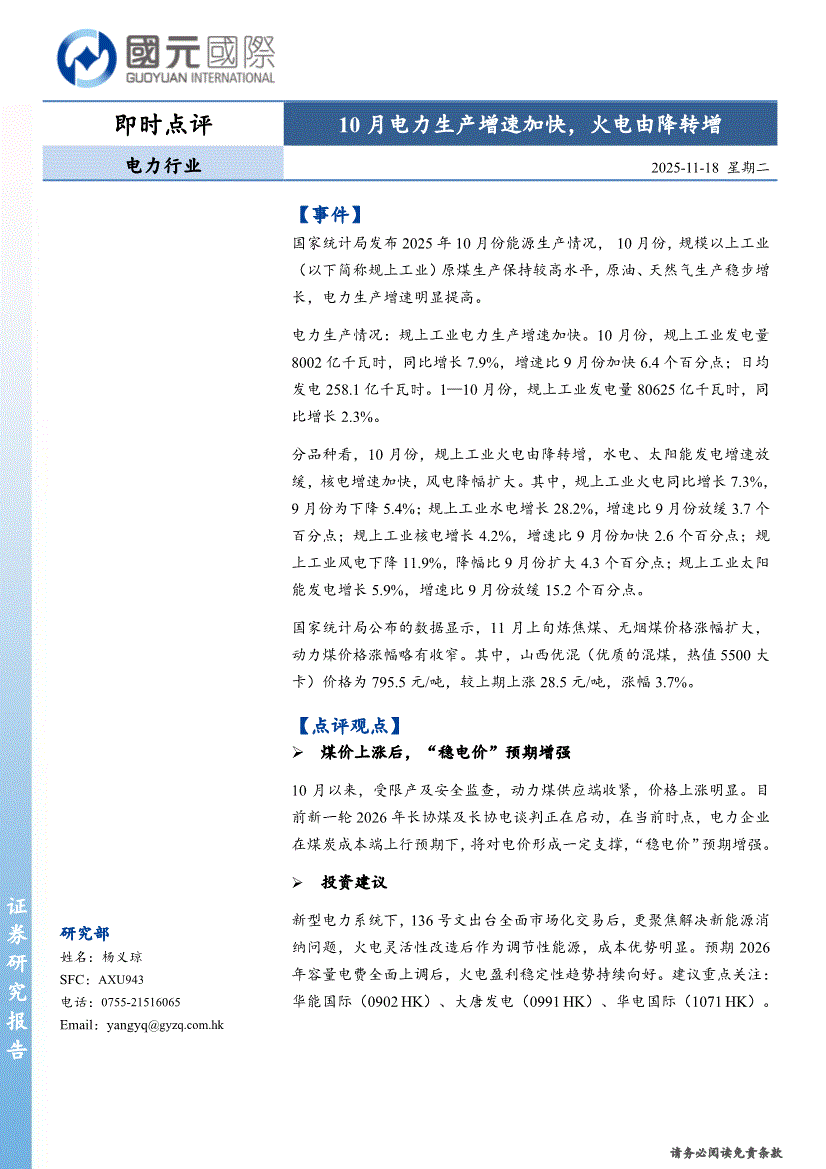 电力行业:国元国际-电力行业即时点评:10月电力生产增速加快,火电由降转增-251118