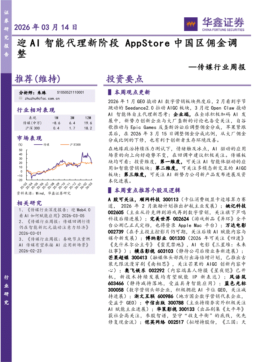 传媒行业:华鑫证券-传媒行业周报:迎AI智能代理新阶段AppStore中国区佣金调整-260314