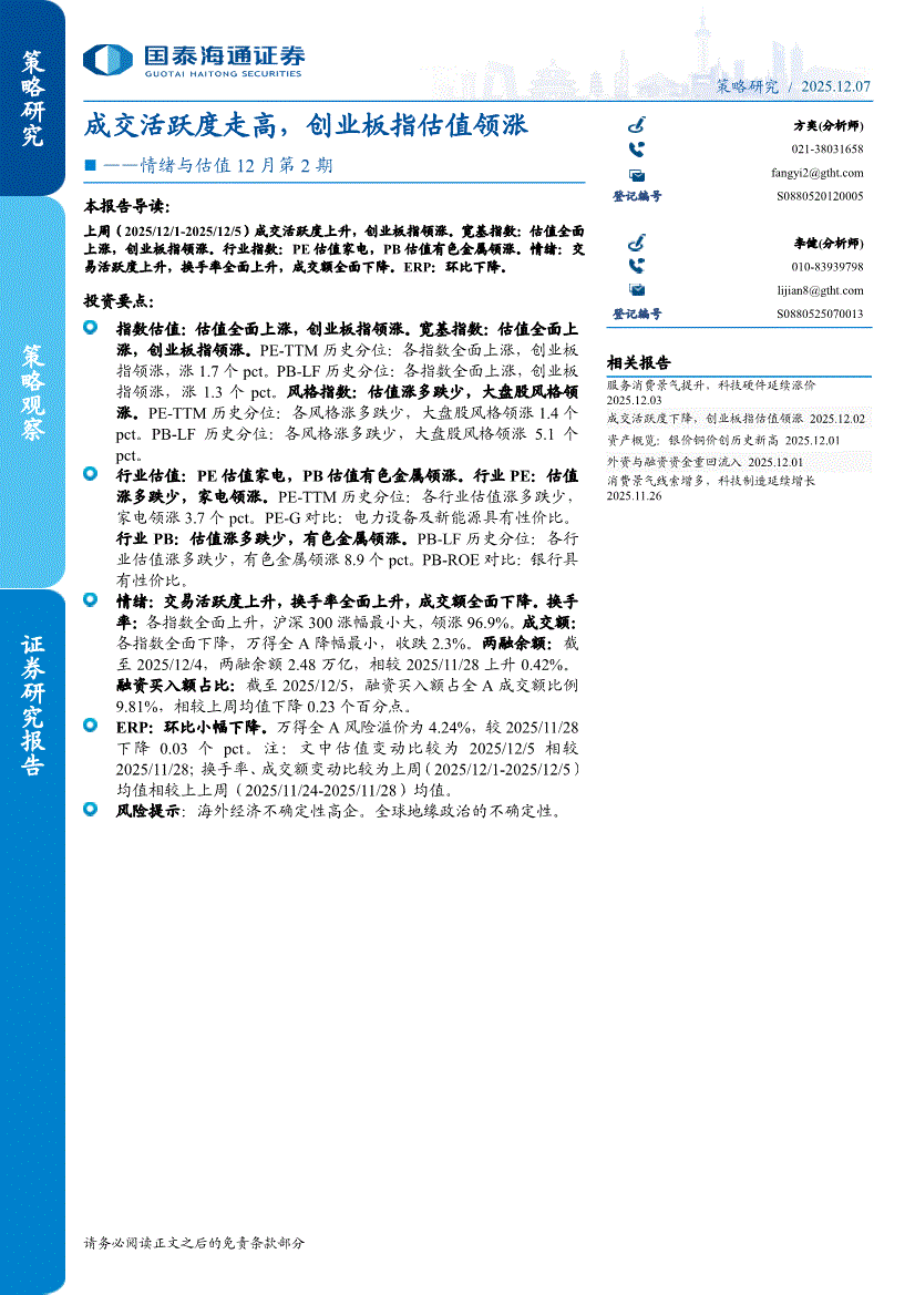 国泰海通证券-情绪与估值12月第2期:成交活跃度走高,创业板指估值领涨-251207