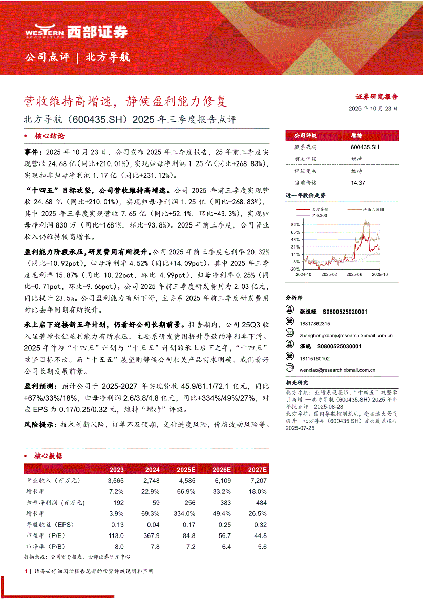 北方导航:西部证券-北方导航-600435-2025年三季度报告点评:营收维持高增速,静候盈利能力修复-251023