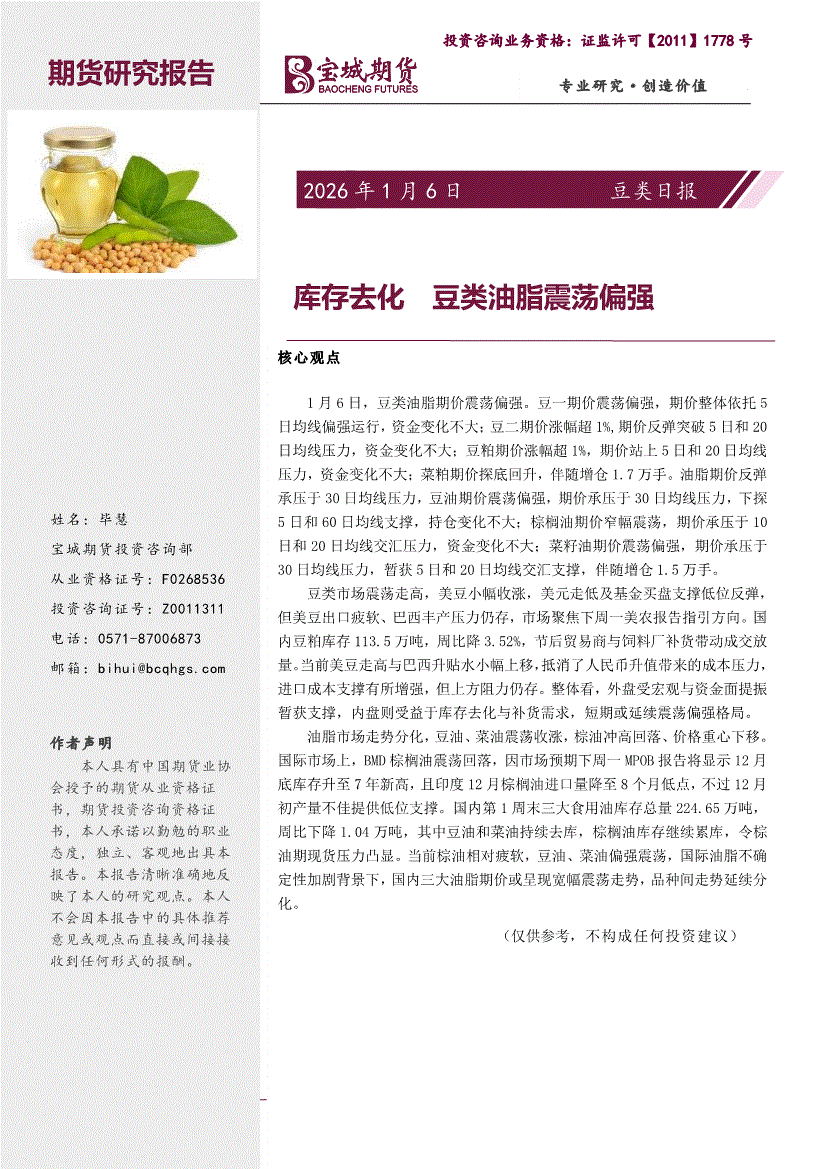 宝城期货-豆类日报:库存去化,豆类油脂震荡偏强-260106