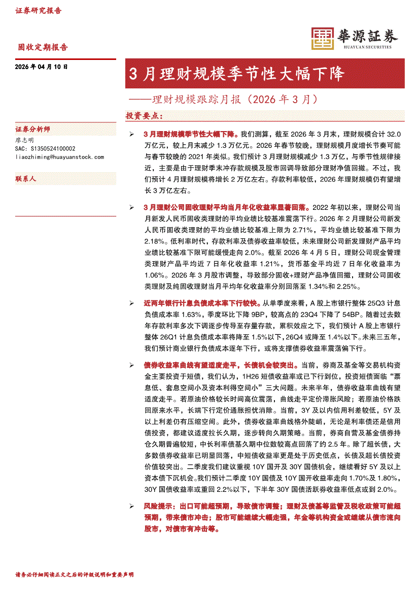 华源证券-理财规模跟踪月报(2026年3月):3月理财规模季节性大幅下降-260410