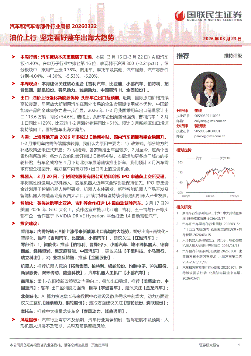 汽车和汽车零部件行业:国联民生证券-汽车和汽车零部件行业周报:油价上行,坚定看好整车出海大趋势-260323