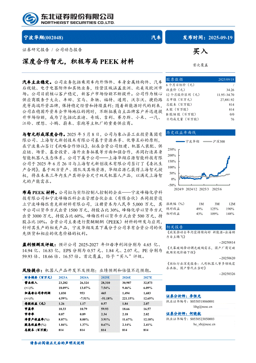 宁波华翔:东北证券-宁波华翔-002048-深度合作智元,积极布局PEEK材料-250919