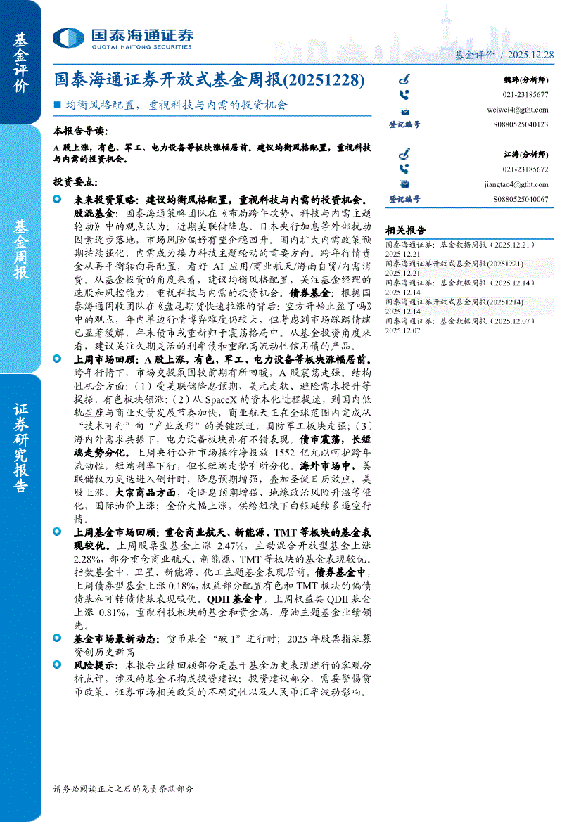 国泰海通证券-开放式基金周报:均衡风格配置,重视科技与内需的投资机会-251228