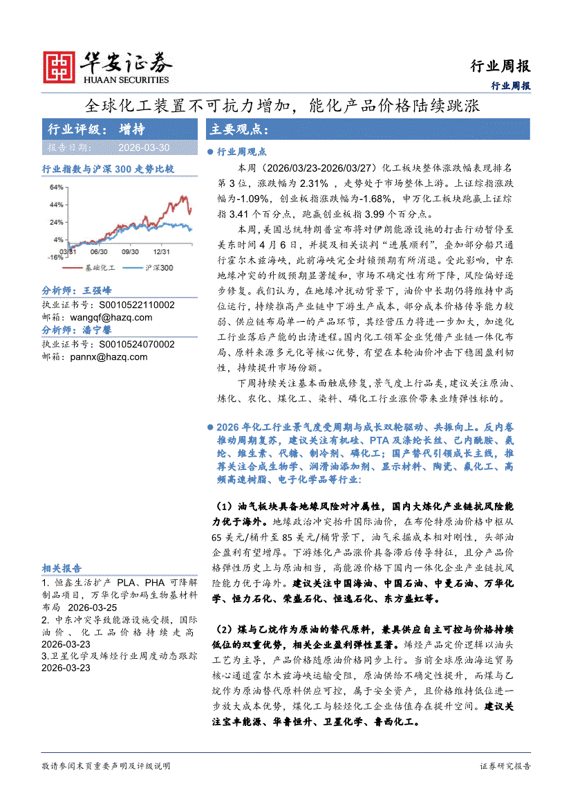 化工行业:华安证券-化工行业周报:全球化工装置不可抗力增加,能化产品价格陆续跳涨-260330