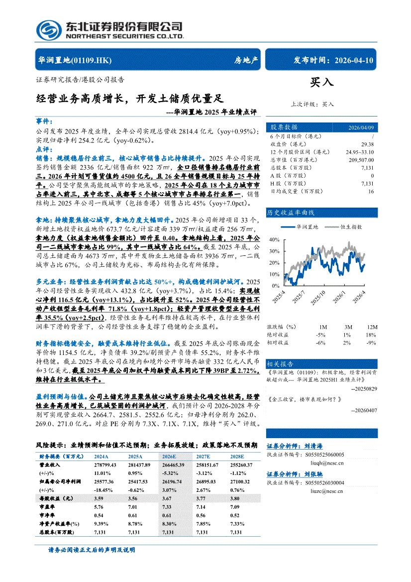 华润置地:东北证券-华润置地-1109.HK-2025年业绩点评:经营业务高质增长,开发土储质优量足-260410