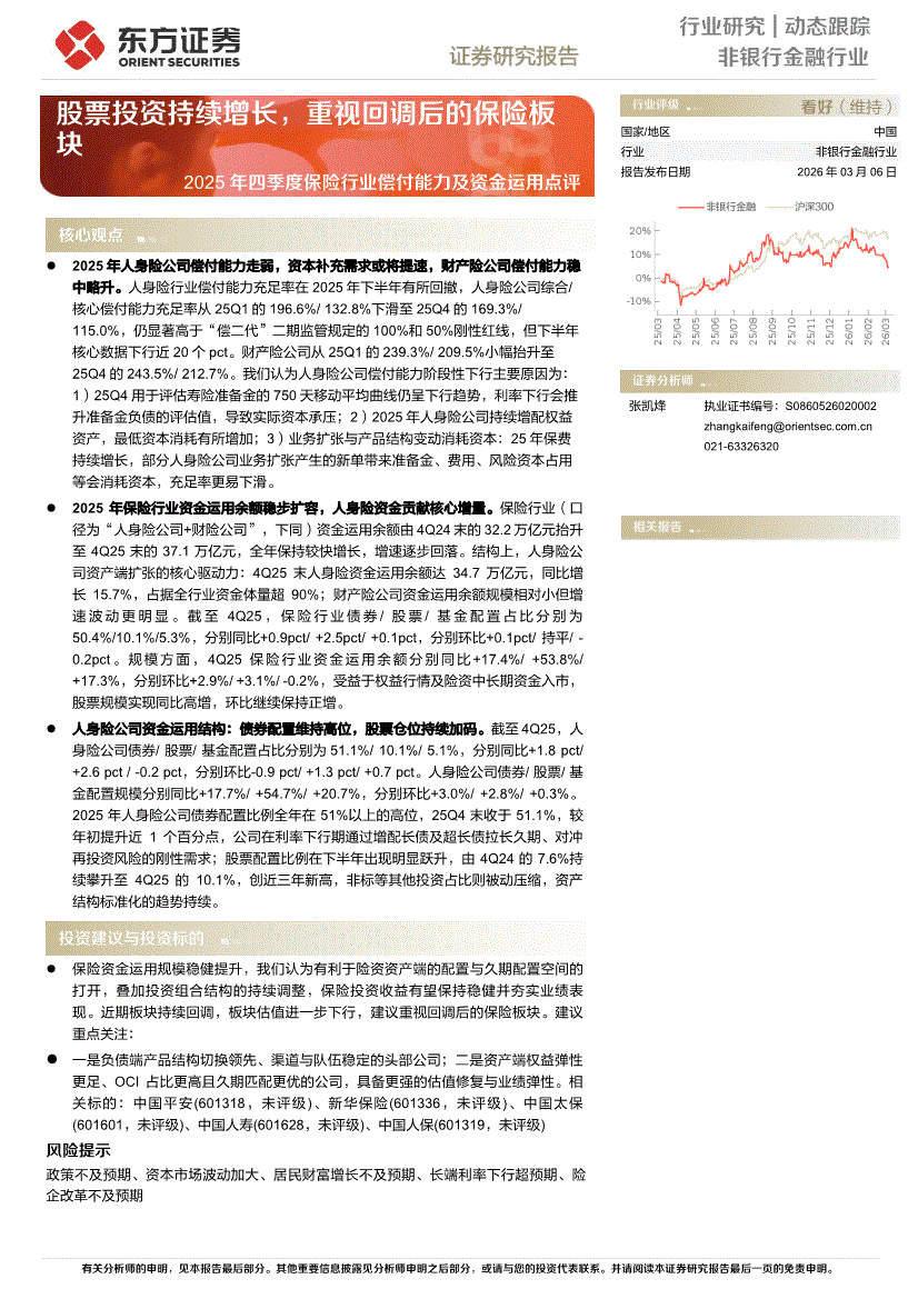非银行金融行业:东方证券-2025年四季度保险行业偿付能力及资金运用点评:股票投资持续增长,重视回调后的保险板块-260306