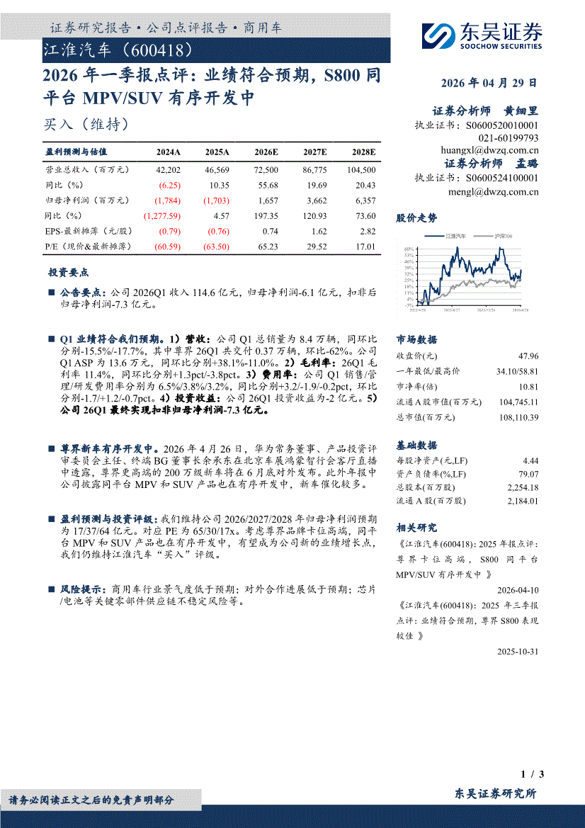 江淮汽车:东吴证券-江淮汽车-600418-2026年一季报点评:业绩符合预期,S800同平台MPVSUV有序开发中-260429