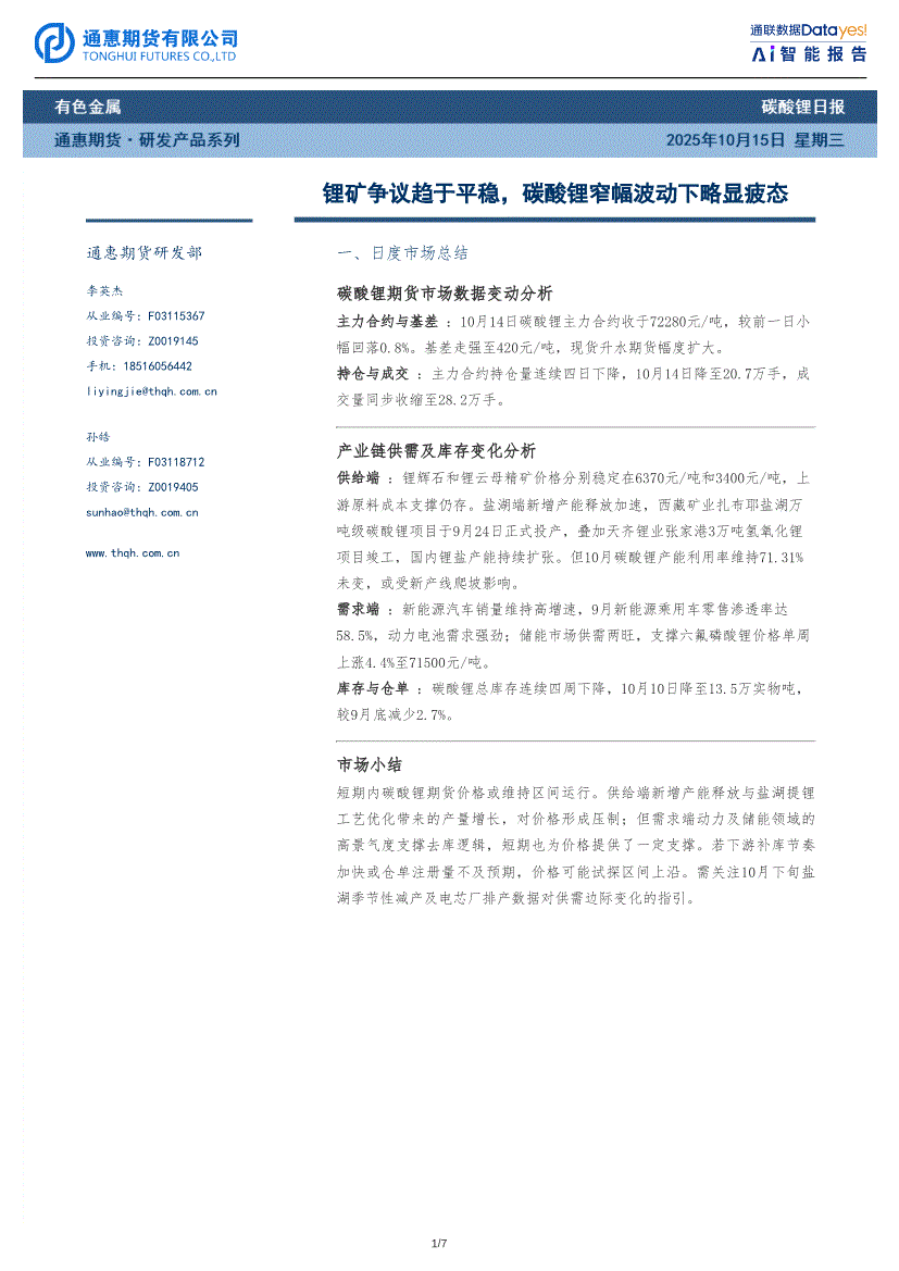 通惠期货-碳酸锂日报:锂矿争议趋于平稳,碳酸锂窄幅波动下略显疲态-251015