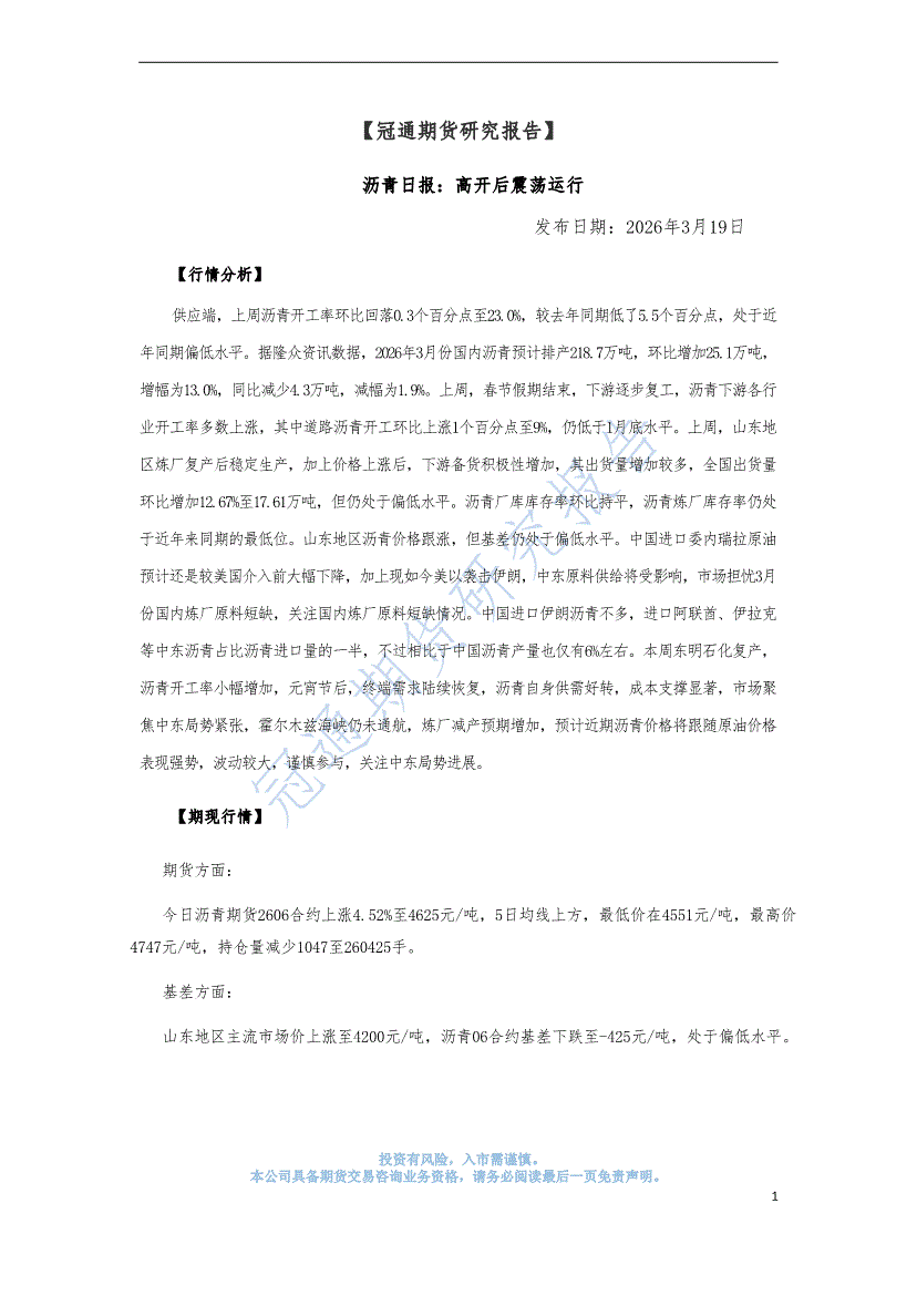 冠通期货-沥青日报:高开后震荡运行-260319