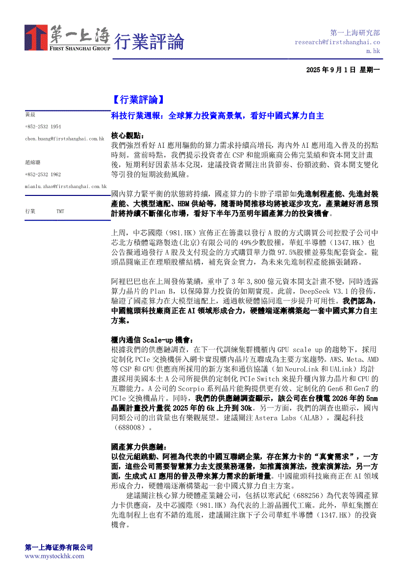 科技行业:第一上海-科技行业周报:全球算力投资高景气,看好中国式算力自主-250901