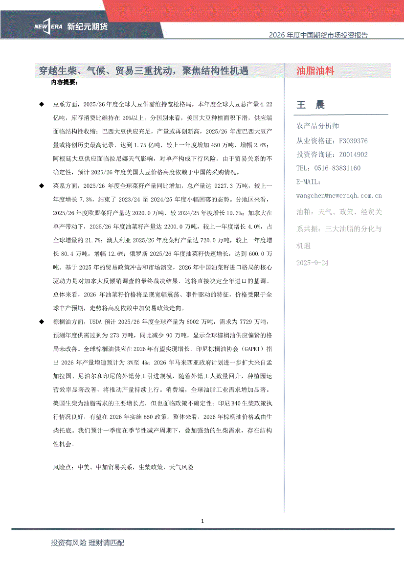 新纪元期货-2026年度中国期货市场投资报告:油脂油料,穿越生柴、气候、贸易三重扰动,聚焦结构性机遇-250924