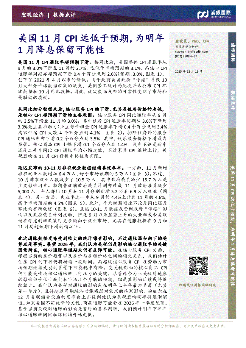 浦银国际-美国11月CPI远低于预期,为明年1月降息保留可能性-251219