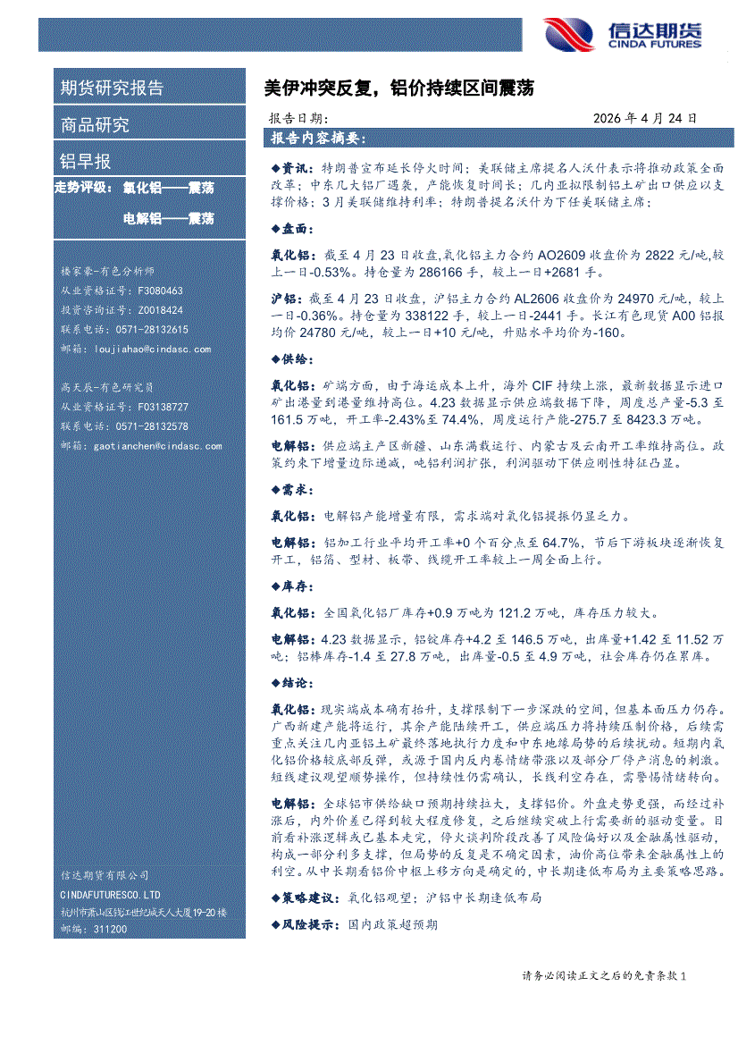 信达期货-铝早报:美伊冲突反复,铝价持续区间震荡-260424