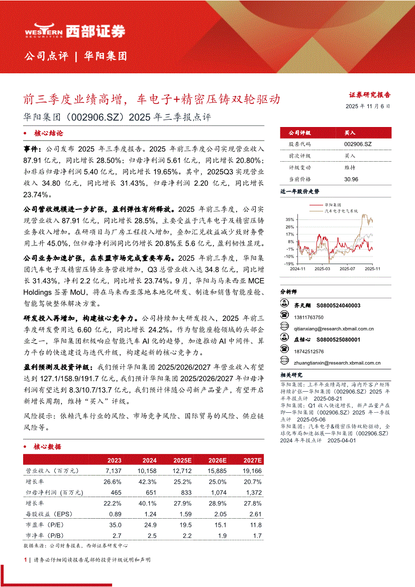 华阳集团:西部证券-华阳集团-002906-2025年三季报点评:前三季度业绩高增,车电子+精密压铸双轮驱动-251106