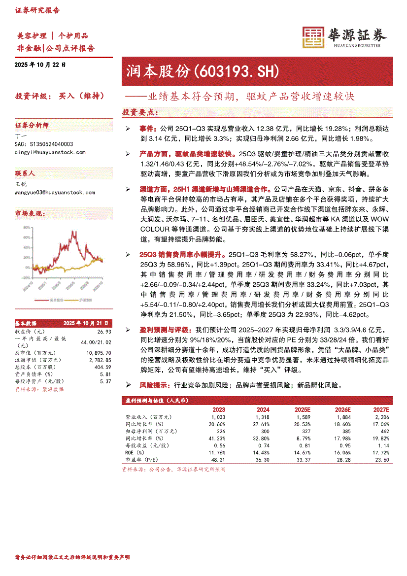 润本股份:华源证券-润本股份-603193-业绩基本符合预期,驱蚊产品营收增速较快-251022