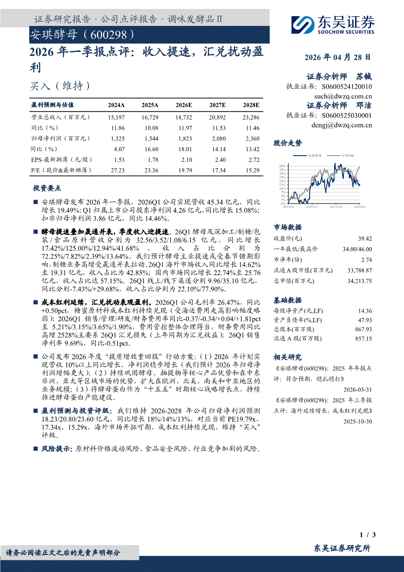 安琪酵母:东吴证券-安琪酵母-600298-2026年一季报点评:收入提速,汇兑扰动盈利-260428