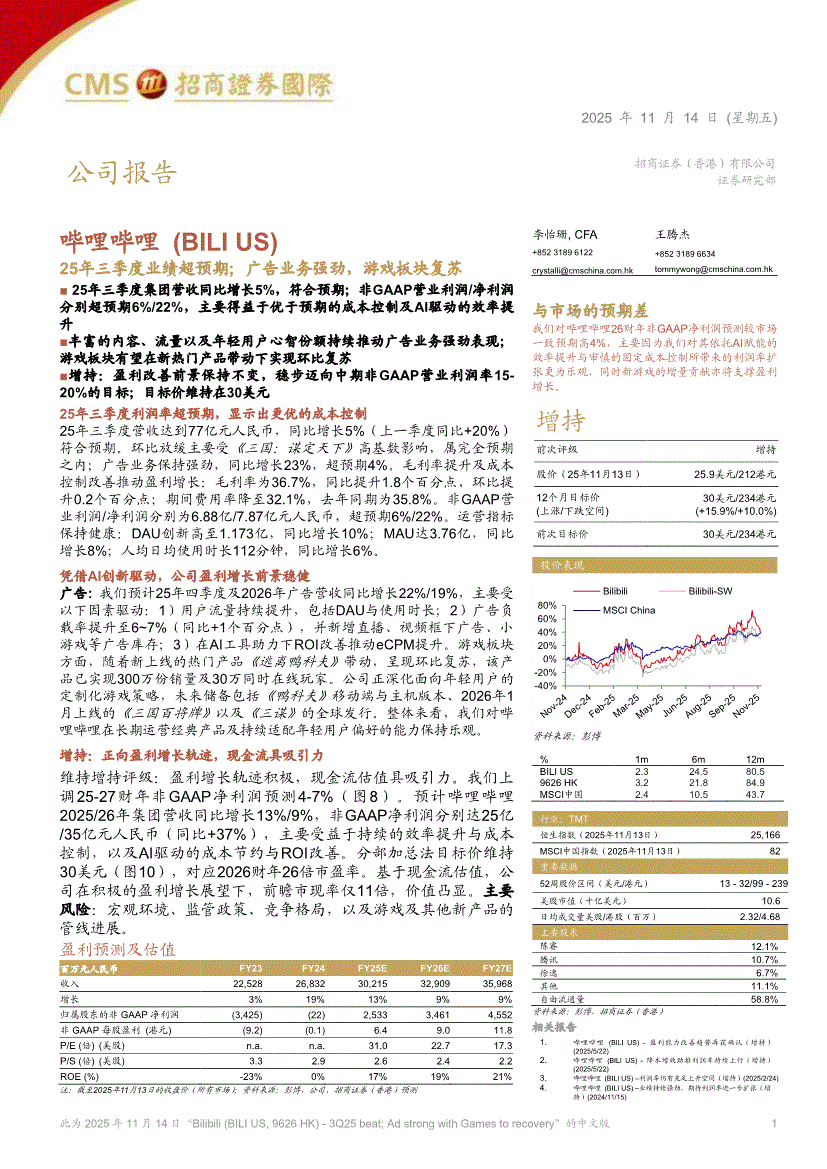 哔哩哔哩:招商证券(香港)-哔哩哔哩-BILI.US-25年三季度业绩超预期;广告业务强劲,游戏板块复苏-251114