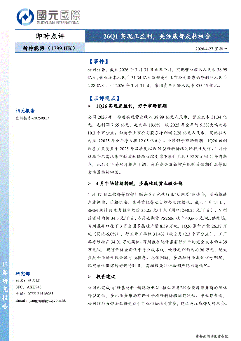 新特能源:国元国际-新特能源-1799.HK-26Q1实现正盈利,关注底部反转机会-260427