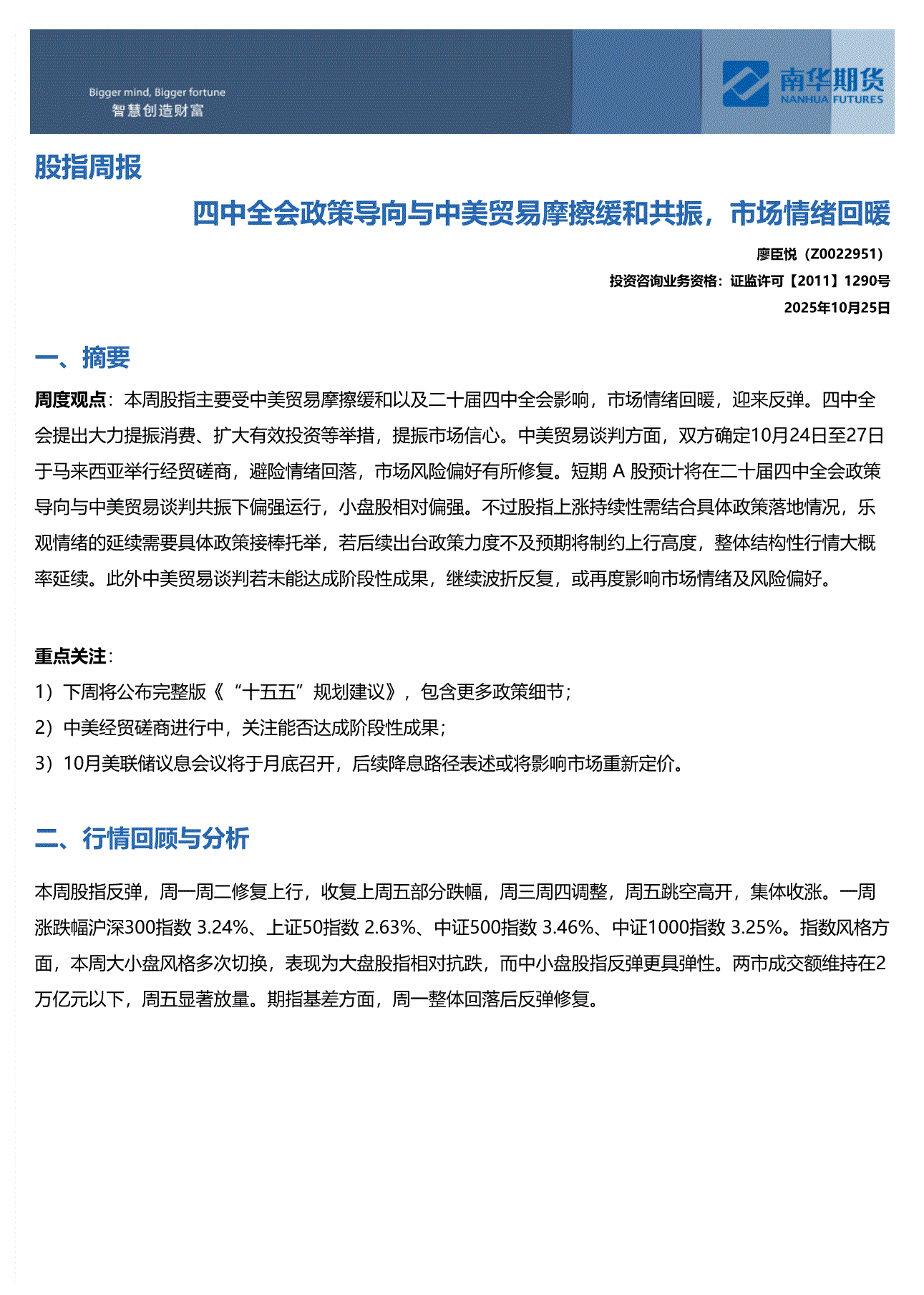 南华期货-股指周报:四中全会政策导向与中美贸易摩擦缓和共振,市场情绪回暖-251025