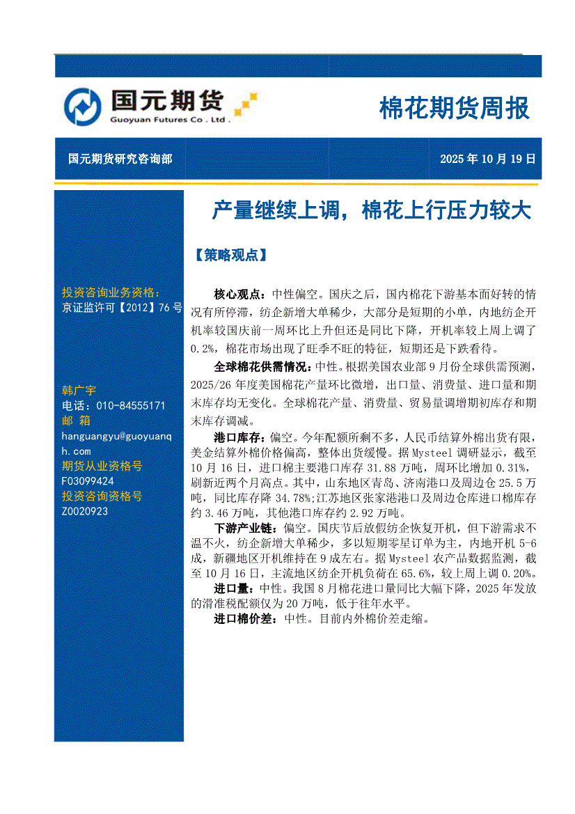 国元期货-棉花期货周报:产量继续上调,棉花上行压力较大-251019