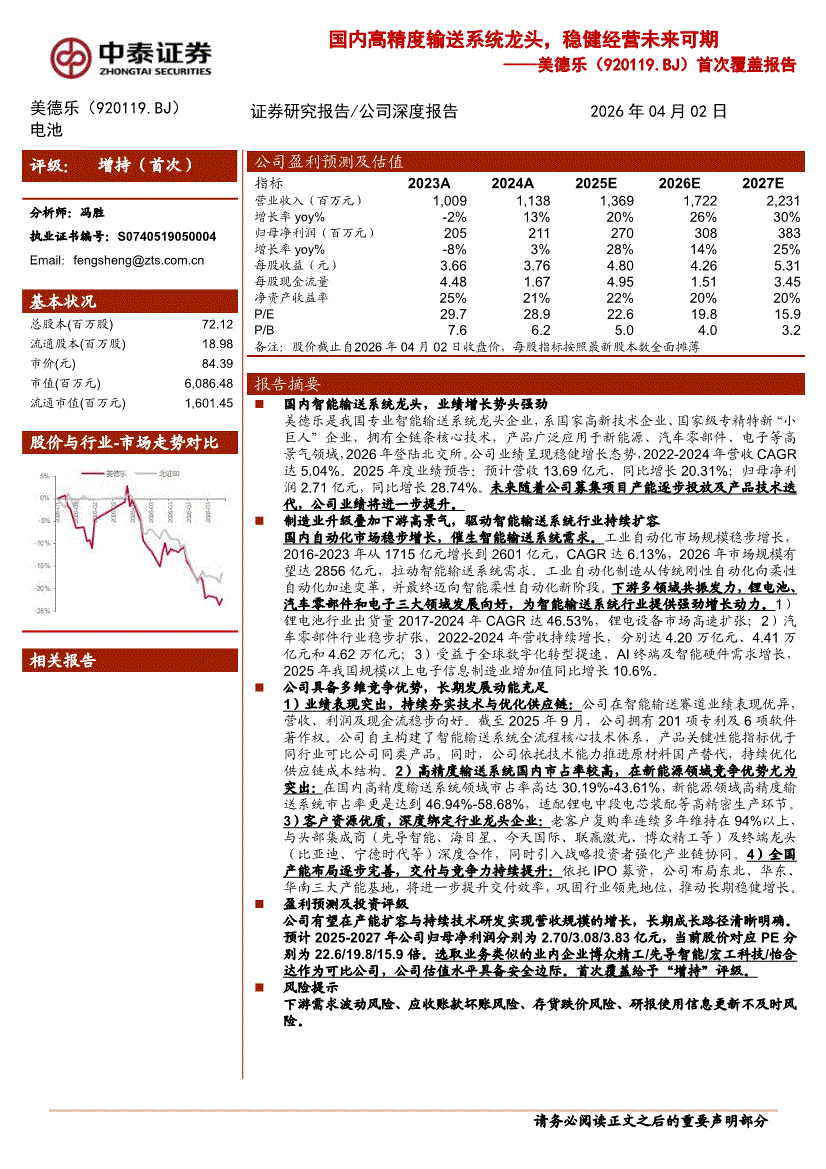 美德乐:中泰证券-美德乐-920119-首次覆盖报告:国内高精度输送系统龙头,稳健经营未来可期-260402