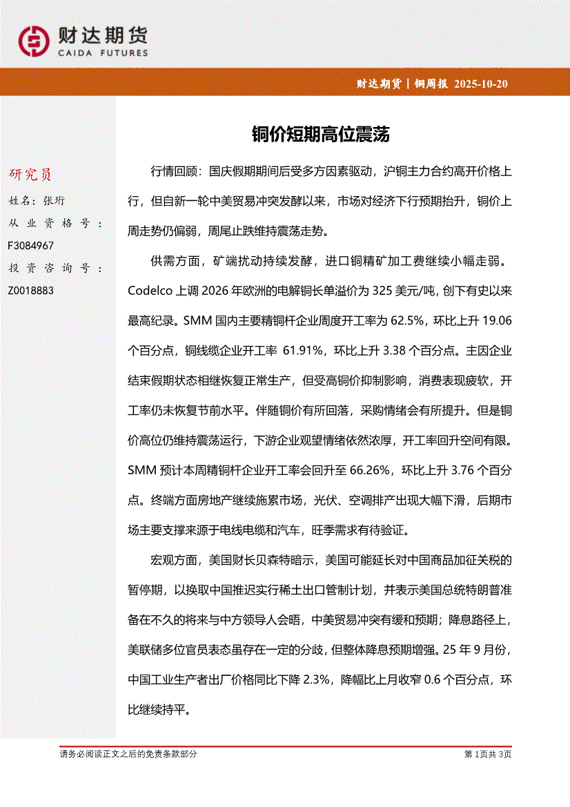财达期货-铜周报:铜价短期震荡偏弱-251013