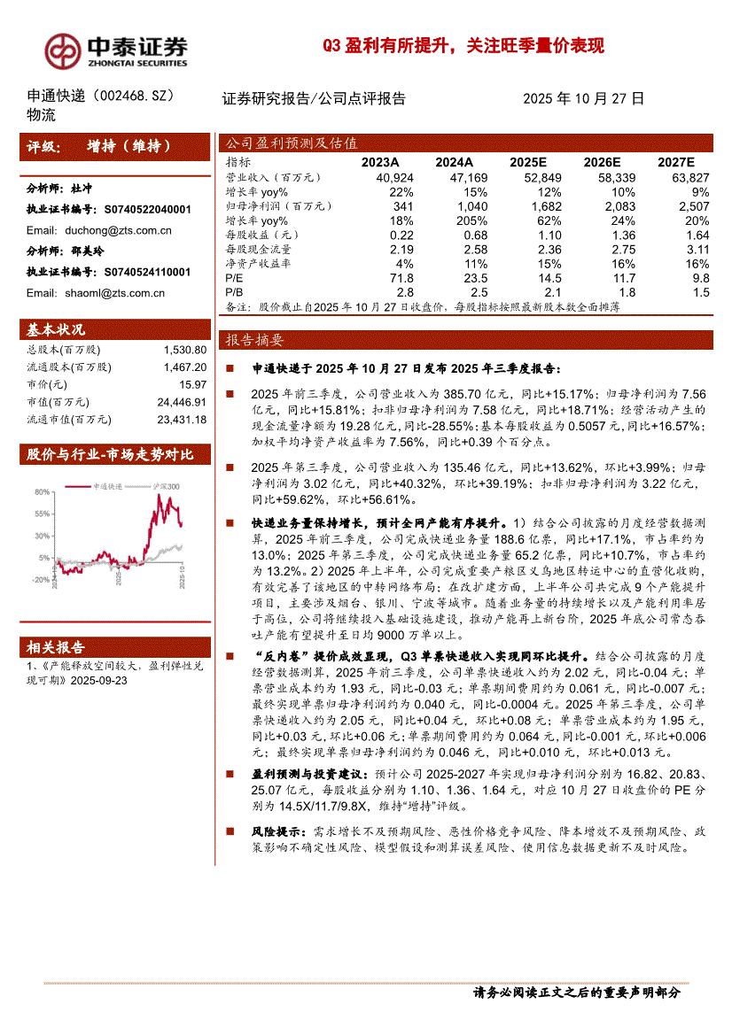 申通快递:中泰证券-申通快递-002468-Q3盈利有所提升,关注旺季量价表现-251027