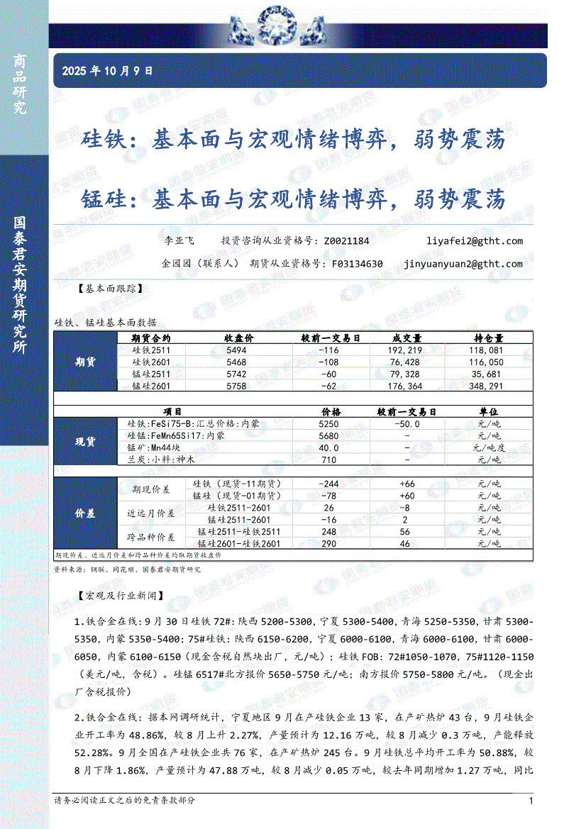 国泰君安期货-硅铁:基本面与宏观情绪博弈,弱势震荡,锰硅,基本面与宏观情绪博弈,弱势震荡-251009